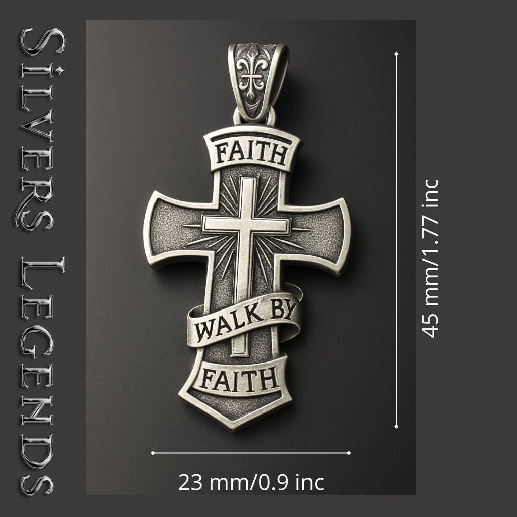 The pendant features engraved Walk by Faith text, blackened by oxidation for contrast, and polished edges that reflect light beautifully. It’s 45 mm (1.77") tall, 23 mm (0.9") wide, and 4 mm (0.16") thick, with a bail fitting up to 4.5 mm (0.18") chains.